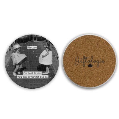 Coaster reads “Sisters – The best friend you can never get rid of.”
