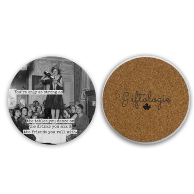 Coaster reads “You’re only as strong as the tables you dance on, the drinks you mix and the friends you roll with”